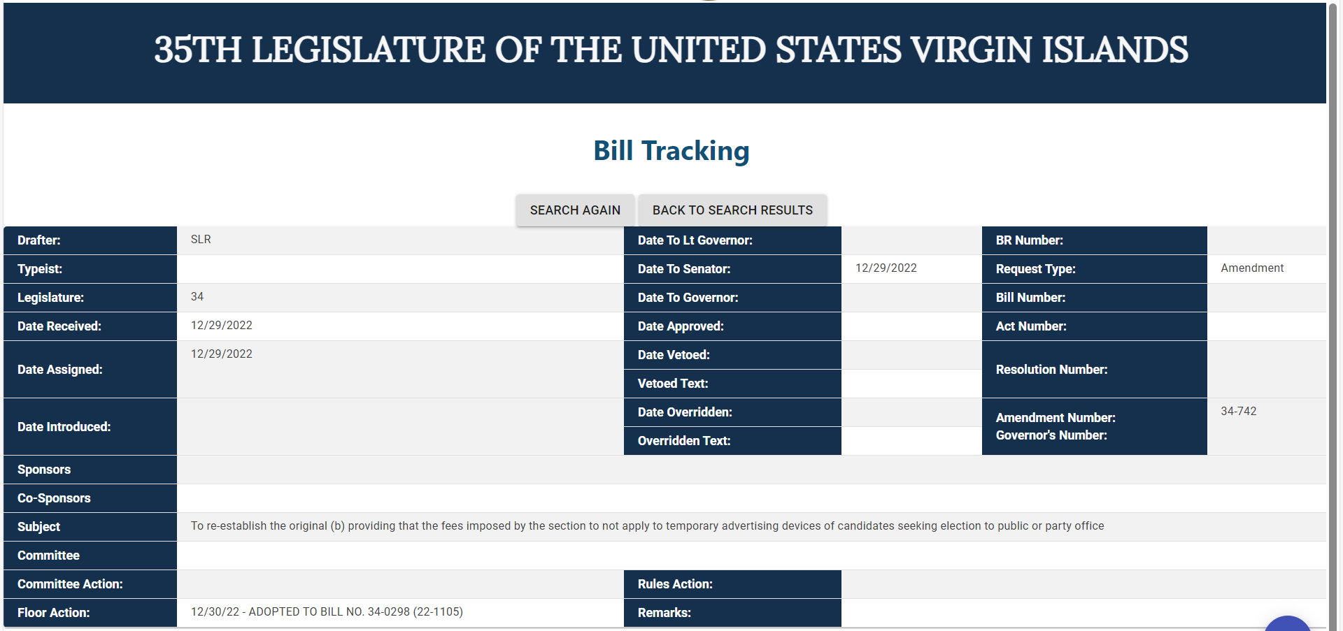 "And for other purposes" included Section 14 that casually slipped in: "Title 29 Virgin Islands Code, chapter 9, section 506 is amended by reenacting subsection (b) to read as follows: (b) subsection (a) does not apply to temporary advertising devices of candidates seeking election to public or party office."