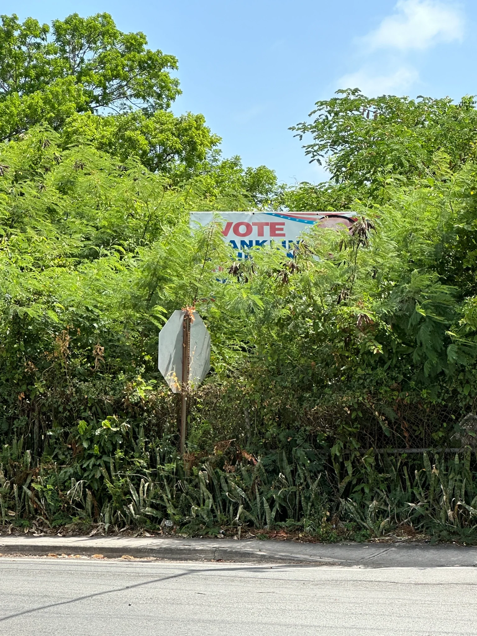 (May 20, 2024) A unpaid campaign sign abandoned by Franklin Johnson sits buried behind unkept vegetation on private property since the previous election. It has since been cleared.